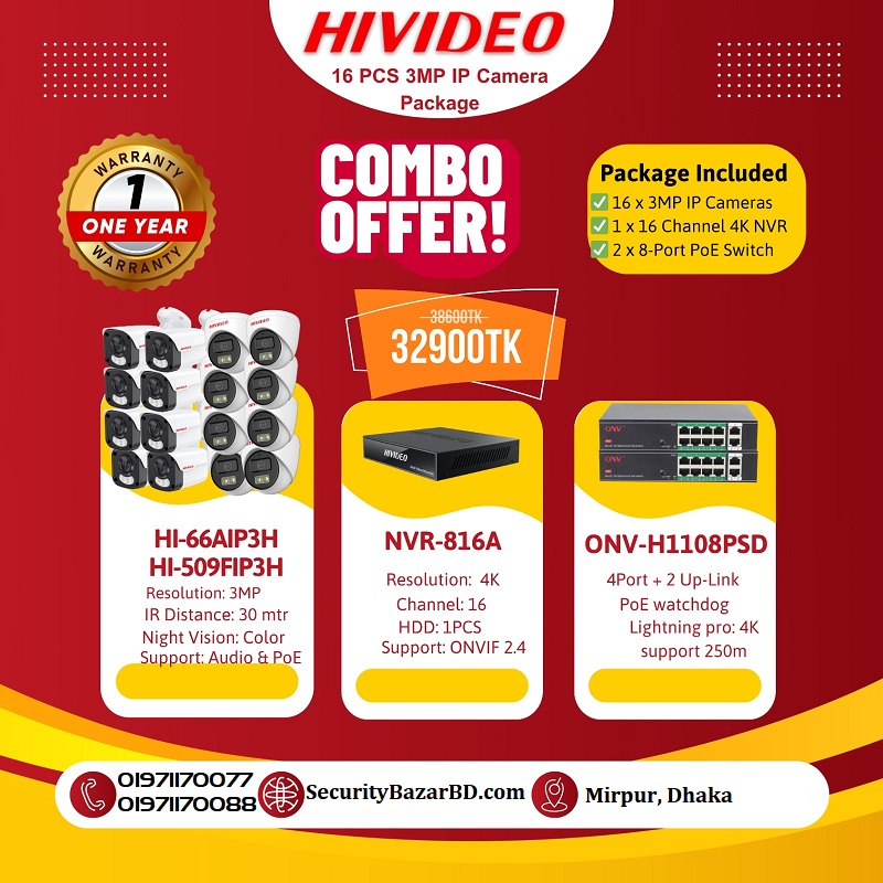 Hivideo 3MP Full Color IP Camera Kit 16 Camera Package