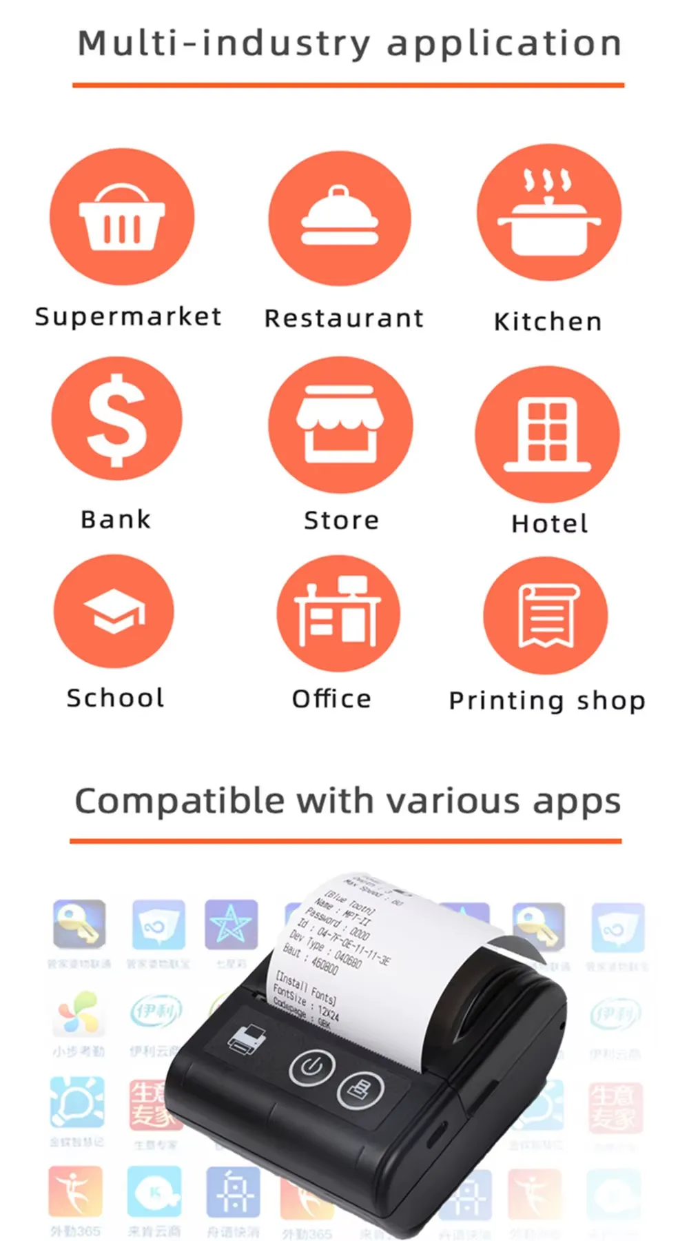 Features: Thermal receipt printer, 48mm print width, 50-80mm/s print speed, clear printing and high efficiency. Direct thermal printing, eliminating the need of ink cartridge or consumable, environmental friendly and money saving. USB and Bluetooth connection, support edit with “DLabel”(software or APP), support ESC/POS command, compatible with Windows XP/7/8/10, Android, iOS. Widely used in Lable Receipt Shipping Exrpress , supermarket, shopping mall, restaurant, cafe, bank for printing receipt, post receipt, order, barcode, etc.